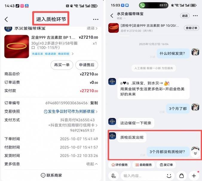 打开“人民投诉”,类似的订单“烂尾”故事不在少数。广州的罗先生在抖音平台购买近两万元黄金手镯,订单在金价上涨后同样陷入“虚假发货”状态。他向质检中心求证,对方称收到的是空包裹。“金价跌了就正常发,涨了就玩消失,这不是商业诚信问题,而是赤裸裸的欺诈。”罗先生愤慨道。